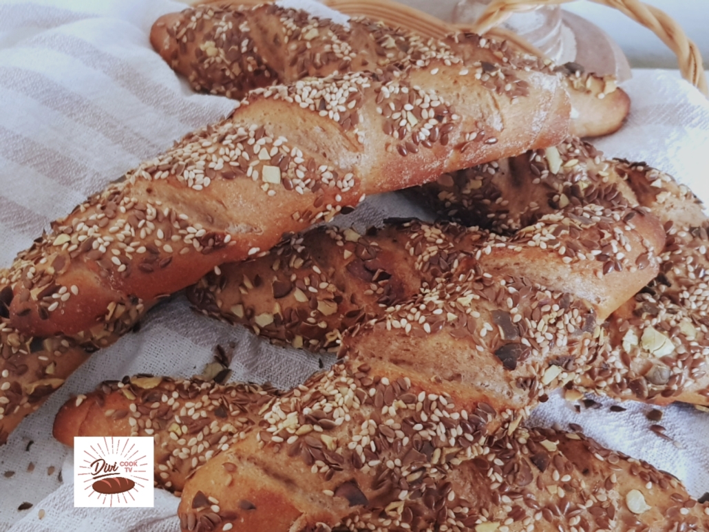 - Vor dem Backen mit einem scharfen Messer einige Male schräg einschneiden, mit Wasser besprühen und im vorgeheizten Backofen bei 210 Grad Heißluft ( mit viel Dampf) für ca. 15 min backen.