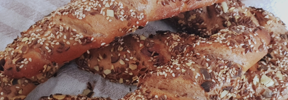 - Die Teiglinge länglich ausrollen ( 27 cm – 29 cm) und dann von der kurzen Seite her aufrollen, mit Wasser besprühen und in den Körnern ( Sesam + Kürbiskerne + Leinsamen) wälzen.